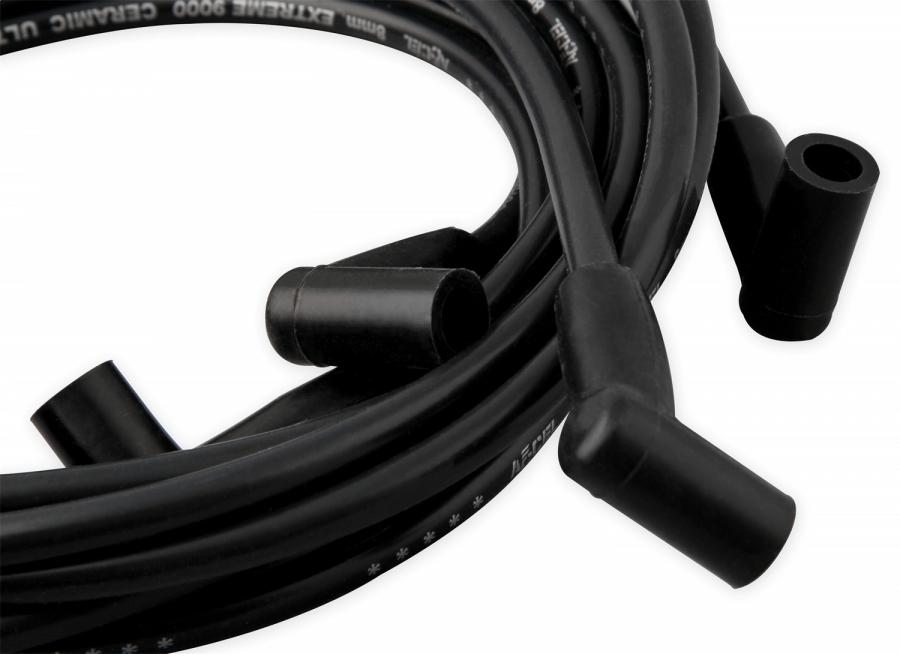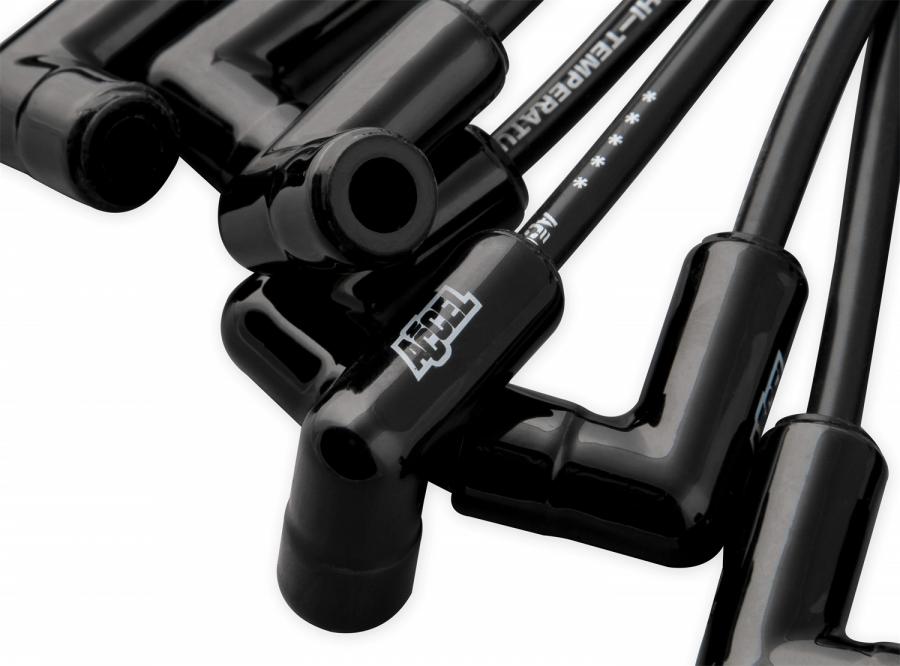 Do you want to put headers on your vehicle, but are afraid you may cook the spark plug wires? Just looking for a nice upgrade for your stock spark plug wires? If you answered yes to any of these questions, ACCEL has the wire set for you. ACCEL Extreme 9000 Ceramic Boot Wires feature ultra high-temperature, double silicone, 8mm, 500 ohms/ft Ferro-Spiral core wire developed for performance use. The wire is rated at 600 degrees Fahrenheit peak and the black Ceramic boots withstand up to 2,000 degrees. Great for running headers with close tolerances, an engine bay with little room or an application with high under-hood temps. ACCEL Extreme 9000 wires offer excellent energy delivery to the spark plugs through stainless steel spark plug terminals, while providing the highest level of RFI/EMI suppression.