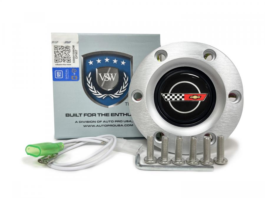 VSW S6 button features S6 Premium brushed horn cap and pairs perfectly with C4 hub adapter. This is a two wire contact horn button with official Corvette emblem.
