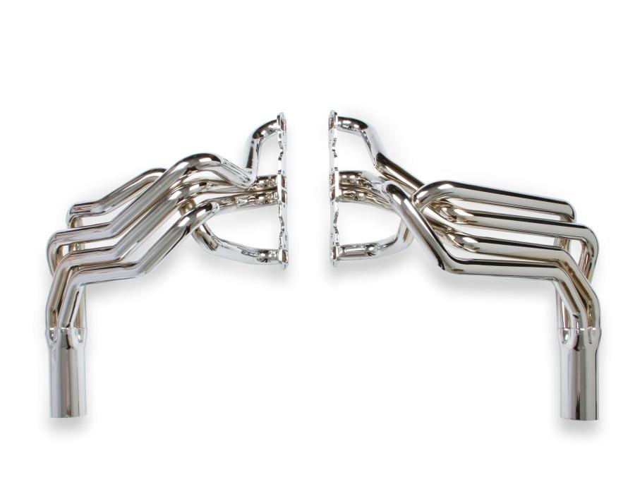 Super Competition Sidemount headers deliver the most aggressive style and performance for your early Corvette. Sidemount headers are built from lightweight 18 gauge tubing. Sidetubes slip directly to the collector for a leak free seal. Hooker sidemount headers and sidetubes come with 3 choices of coating; show quality chrome, high heat resistant black paint and Hooker's Metallic Ceramic Thermal Barrier Coating. Replaceable Hooker mufflers are available separately in 2 different styles; glasspack and reverse flow. The glass pack style provides the highest performance with minimal backpressure and sound control. The reverse flow is designed for maximum sound control.