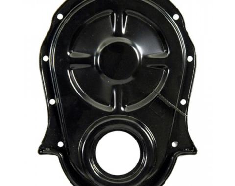 Faithful reproduction in OEM thickness stamped steel includes correct timing tab with "A O R" markings welded to cover as original. The 66 cover has a provision for center bolt to go through the oil pan to timing cover. There is no hole…