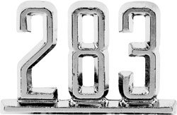 Reproduction of the original front fender emblem designed for use on various 1965-66 GM models. Each emblem is manufactured to exact factory specifications in zinc die-cast metal featuring a bright polished chrome finish. This is a small "283" engine designation for the front fender. Sold individually. 2 required per vehicle.