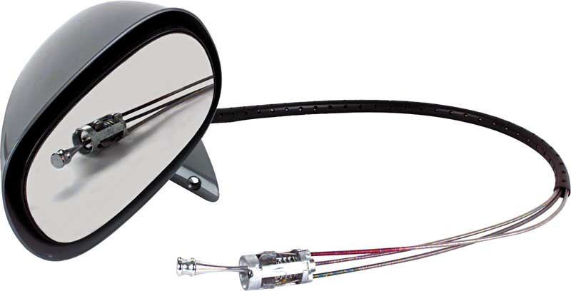 Reproduction of the original remote outer door mirror designed for use on various 1970-81 GM models including Camaro, Firebird, Nova, LeMans, GTO, Cutlass, 442, and others. Each mirror is manufactured from high-quality die-cast zinc and features a factory-style remote swivel design for accurate adjustment and functionality. Comes primered and ready for prep and paint to match the vehicle's exterior finish. Includes the pre-installed remote cable for easy installation and a factory-correct fit.