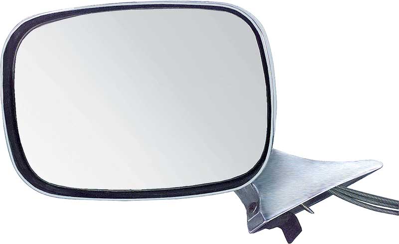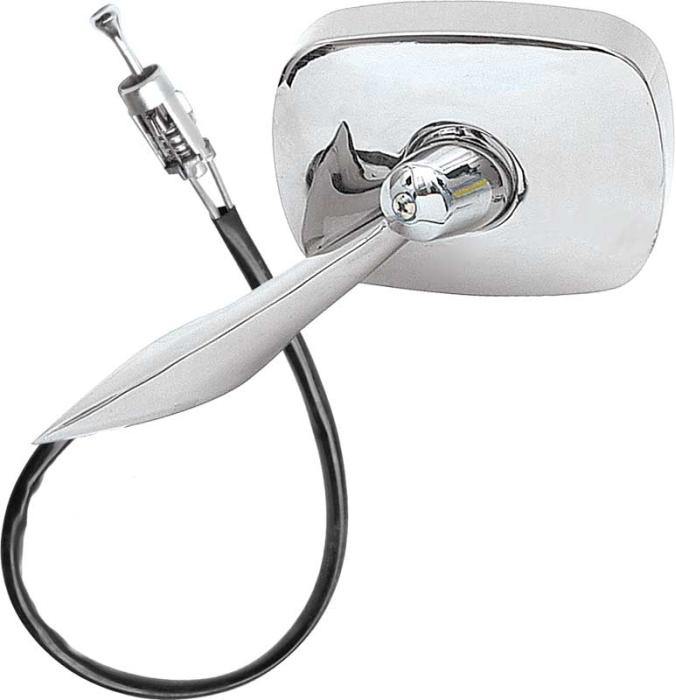 Reproduction of the original outer door remote mirror assembly designed for the driver side of various GM models. Each mirror is precision manufactured from high-quality zinc die-cast metal and replicates the original factory mirror in fit, style, and functionality. This assembly includes most of the components required to replace or add a remote mirror to your vehicle, providing smooth and reliable mirror adjustment from inside the cabin. Features a pointed base design as used on 1968 2nd design Pontiac Firebird models. The interior door panel bezel is available separately under part number #3921833.