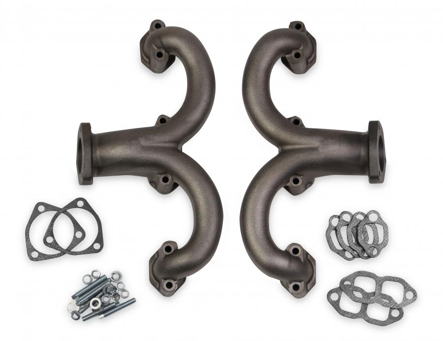 - Cast iron construction styled in the vintage “Rams Horn” design for maximum engine clearance and maximum strength