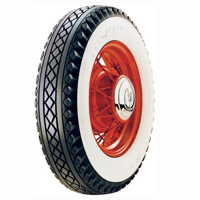The Goodyear Deluxe All-Weather 650-16 bias ply tire is an excellent choice for a Pre-WWII restored car or truck and features a 4 inch wide whitewall. The 650-16 size became the industry standard from 1935 through the late 1940's on larger vehicles like Buick, Hudson and Oldsmobile. This tire features the famous diamond tread pattern and authentic sidewall markings. This iconic tire is perfect for a passenger car, and also works well on light trucks from the era. This tire is also an authentic choice for hot rods and customs. It features four-ply construction with polyester cords, and it is designed to be used with a tube.