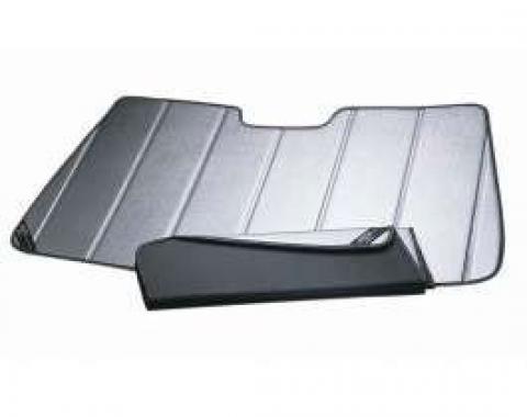 This premium quality, custom patterned folding heat shield has a silver reflective fabric on the outer side, soft felt on the inside and is held in place with the vehicle sun visors with an accordion style fold for storage when not in use.