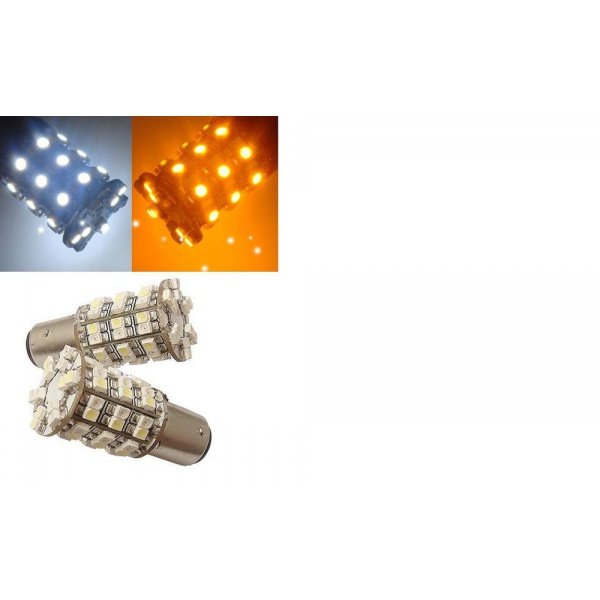 Nice Upgrade From the Standard Bulbs & Much Brighter!! Double The Light Output! 60 LEDs!!! Replaces The 1157 Bulb Wide View Angle/ Piranha Type Hyper White Color For Running Lights & Amber For Turning Light This is for one pair of 1157 LED bulbs (2 bulbs) (Dual Beams)Switch Back Dual Color Design 1157 SMD LED Light Bulbs. NOTE: For Replacement of Your Turn Signal Light, Corner Light, Stop Light, Parking Light, Side Marker Light, Tail Light, and Backup Lights, ETC.. Double the Light Output! The Best and Newest Bulbs on the Market!