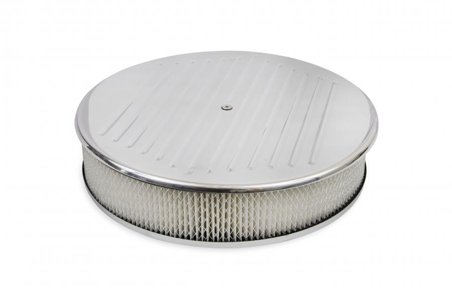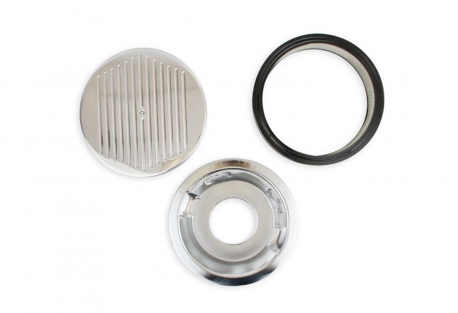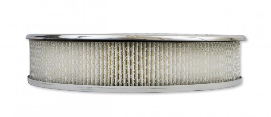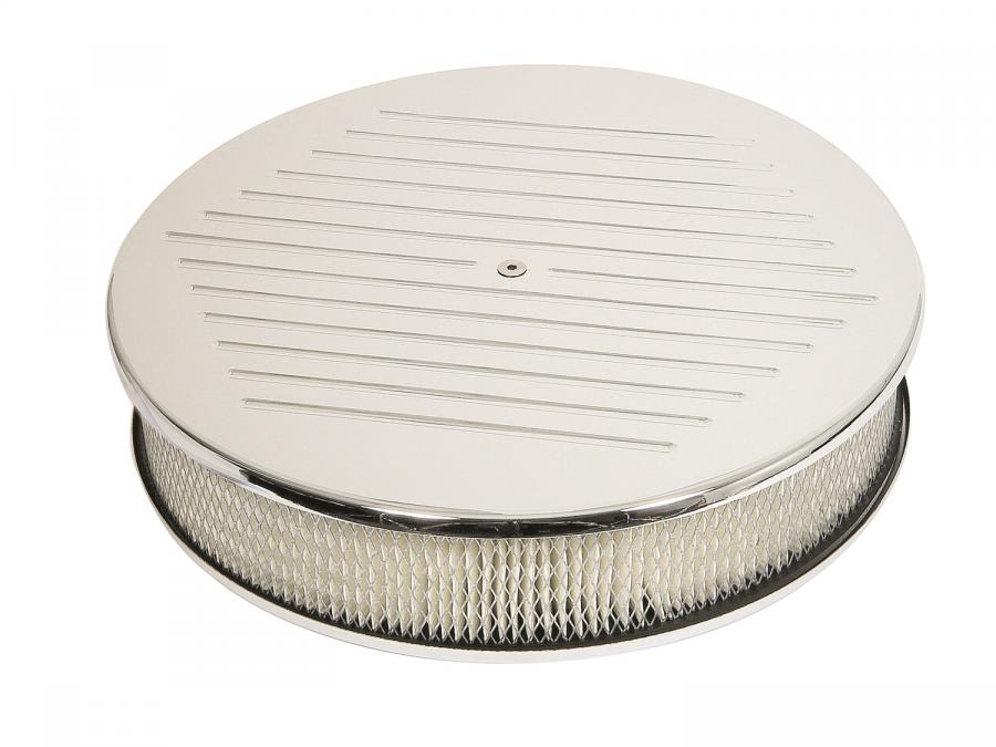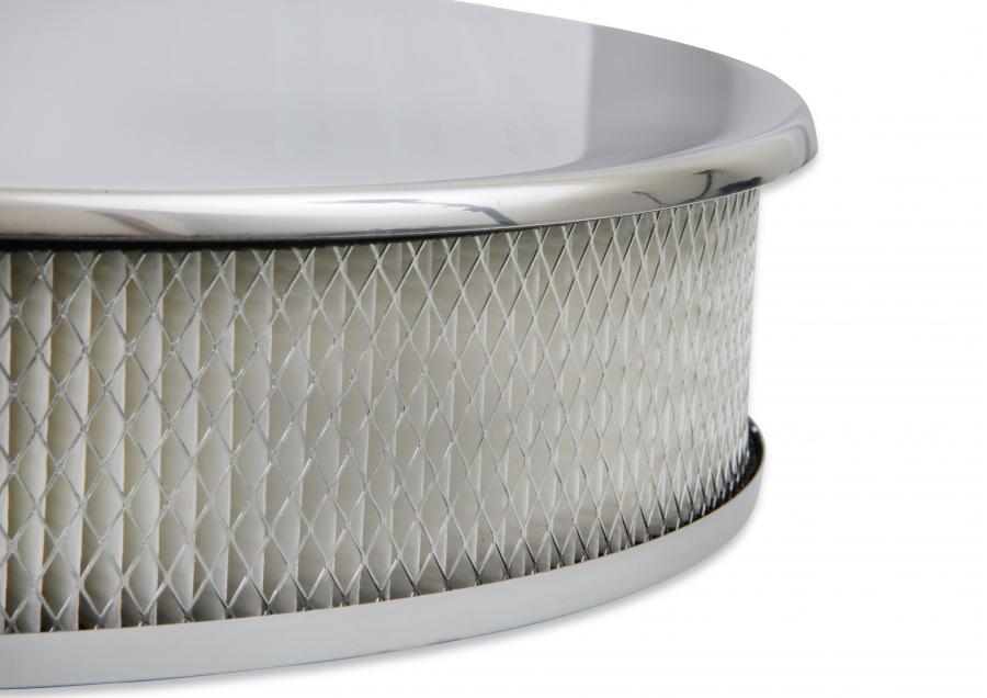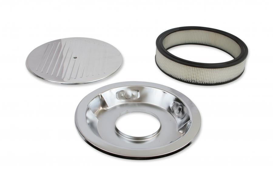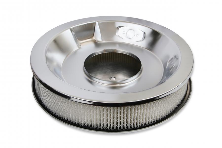 This 14 x 3 inch air cleaner assembly features chromed aluminum lid and base with a replaceable paper air filer element. It fits about any single 4-barrel carburetor with a 5-1/8 inch neck.
