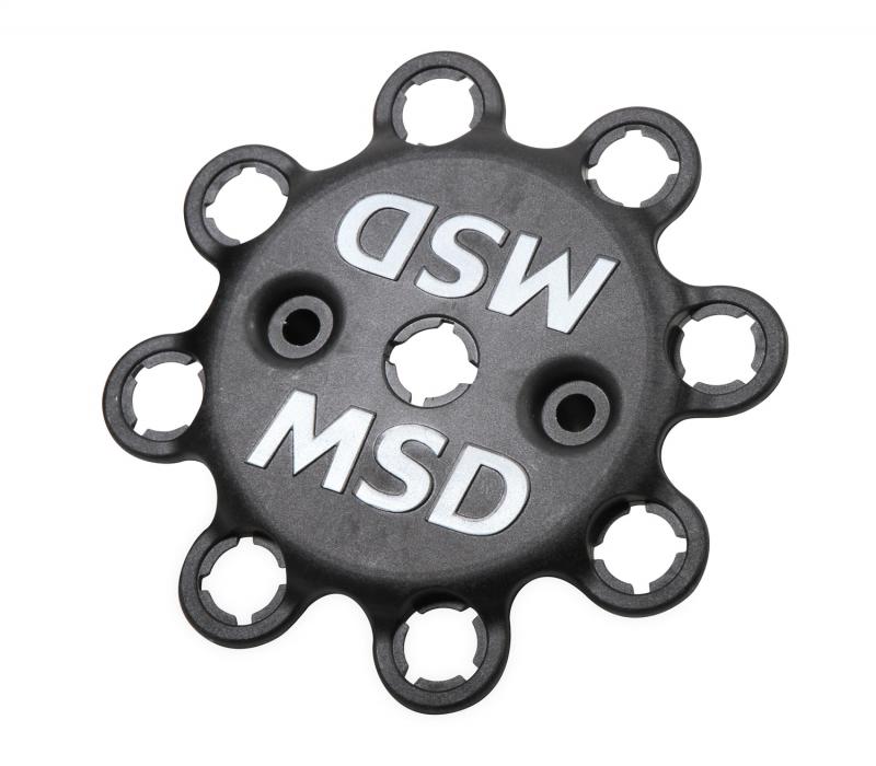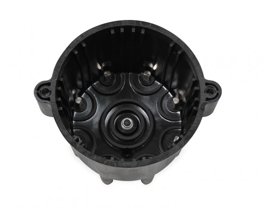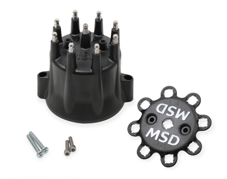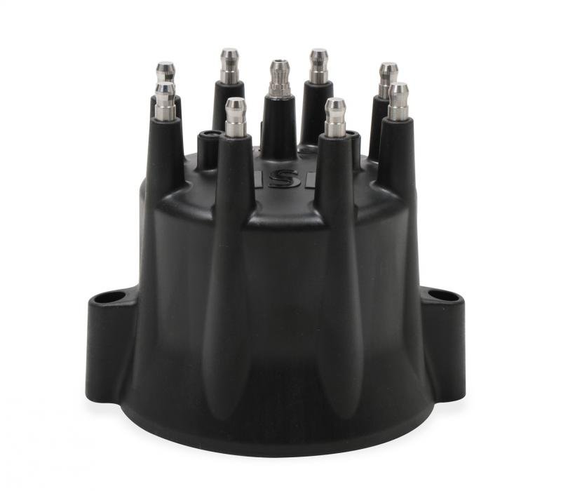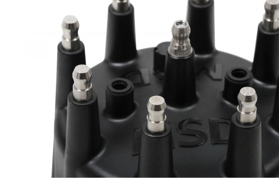MSD Black caps are molded for our most popular V8 distributors in-house. These caps are injection molded from DuPont® Rynite material and feature spark plug-style terminals. These terminals offer improved locking connections and the Rynite material is extremely strong with excellent dielectric properties. This cap comes with an optional wire retainer to lock the wires in place.