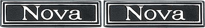 Reproduction of the original "Nova" door panel emblems found on all 1969-72 Chevrolet Nova models with a factory custom interior. Each emblem is manufactured in die-cast zinc to exact factory specifications and features a chrome finish with a matt black background. Will replace the original emblems exactly! Sold in pairs. Note: Not for use with standard interior models.