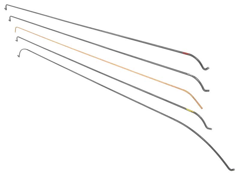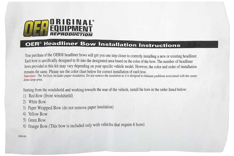 Correct reproduction headliner bow set designed for 1962-64 Chevy II and Nova 2-Door sedan models. These precision-engineered bows are used to properly secure the headliner to the inner roof structure. Each set is produced with correct contours, materials, and bends that match factory specifications for a professional restoration finish. Color-coded for easy front-to-rear identification, this kit also includes color-coded installation instructions to ensure accurate placement during installation.
