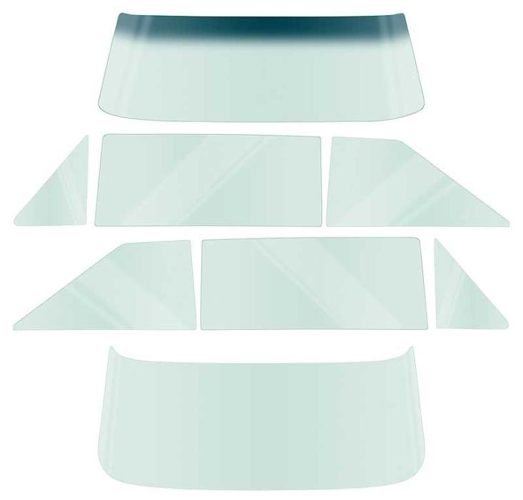 Reproduction glass set includes the front windshield glass, RH and LH vent window glass, RH and LH door glass, RH and LH quarter window glass, and back window glass for a total replacement.