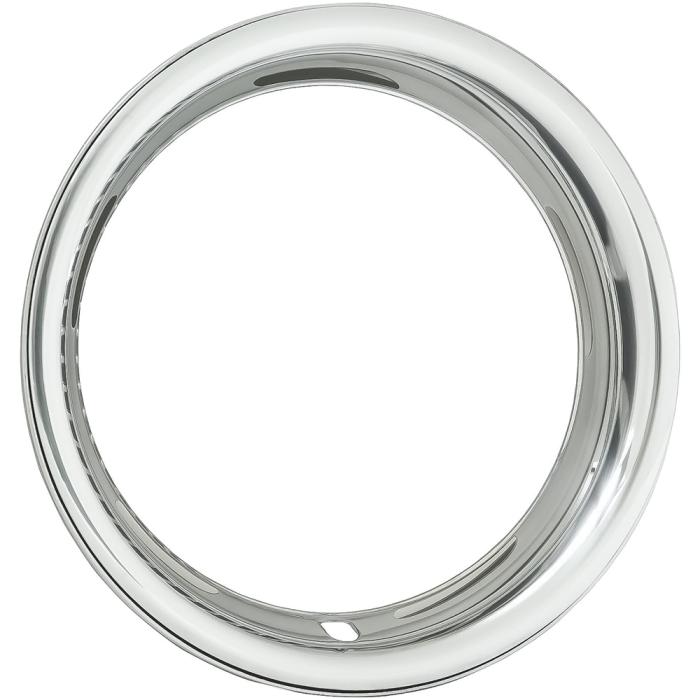This polished stainless steel trim ring is an OEM style trim ring that will fit 15-inch by 6-inch rally wheels. The under lip to inside edge is 1.375 inches. The trim ring will fit most 4-inch and wider 15-inch rally wheel. Can be applied to any 15" x 6" Chevrolet style Rally wheel. Sold individually.