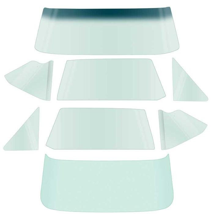 Reproduction glass set includes the front windshield glass, RH and LH vent window glass, RH and LH door glass, RH and LH quarter window glass, and back window glass for a total replacement.