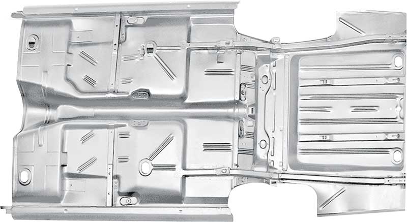 A complete reproduction of the floor pan and trunk pan and braces as one complete assembly for use on 1966-67 Chevy II and Nova models. This combination floor pan and trunk pan assembly is manufactured in stamped steel to original factory specifications featuring correct contours for an authentic appearance and fit. If the floor pan is damaged or rusted, replace it completely with this superb reproduction of the original floor and trunk pan assembly with rear frame rails. Stronger, more durable, and cleaner-looking than using a patchwork of metal panels to restore your floor. This steel reproduction includes the complete floor pan, complete trunk pan, braces and all factory style ribbing as original.