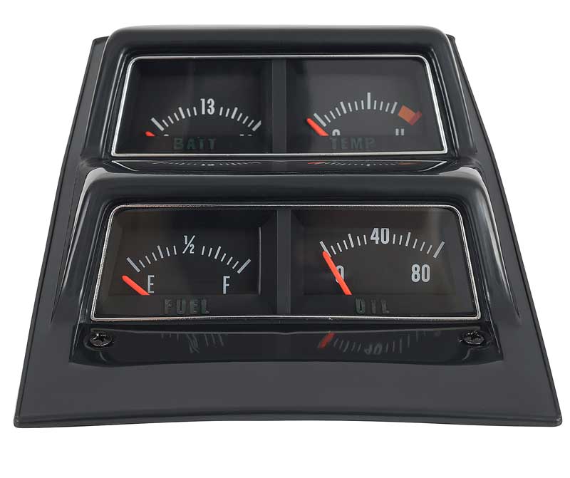 Get the high performance look in your 1968-69 Camaro or 1968-74 Chevy II / Nova with this complete, pre-assembled gauge cluster assembly. Reproduction of the original black-faced console gauge assembly designed for use on 1968-76 Nova models. Manufactured by OER®, this fully pre-assembled and ready-to-install console gauge assembly features the temperature gauge, volt gauge, oil pressure gauge and fuel gauge.