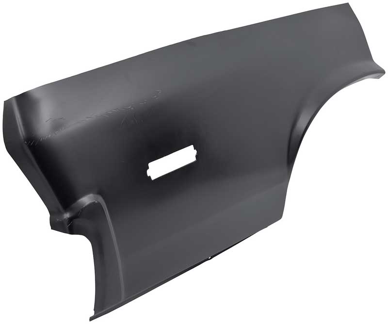 Reproduction of the original rear half section of the quarter panel for use with 1968-74 Chevy II and Nova models. This patch panel will replace the lower rear quarter panel section from the area behind the rear bumper to the middle of the wheel well. This is a partial quarter panel skin that extends to the center body line. This panel features the side marker lamp cut-out. Measures approximately: 56" in length x 21" tall x 9-1/2" tall above wheel well center