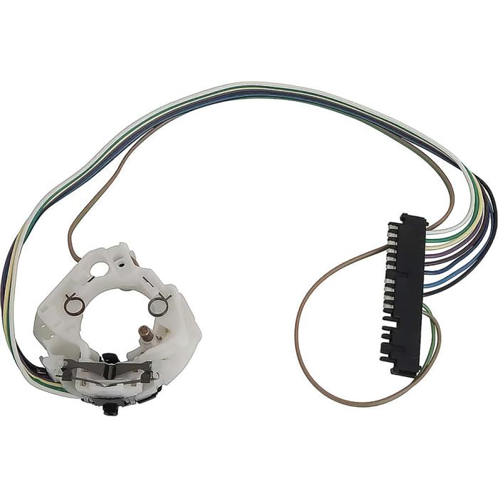 Reproduction turn signal switch for various 1969-76 GM models. Located in the steering column, this switch features the correct color-coded wiring and proper 3-7/8" wide plastic connector for a plug-in installation. 10 wire switch. Replaces OE part #s 1997938, 1893588, 3197000, 8121438, or Delco # D6208, SMP # TW-12, Shee Mar # SM208.
