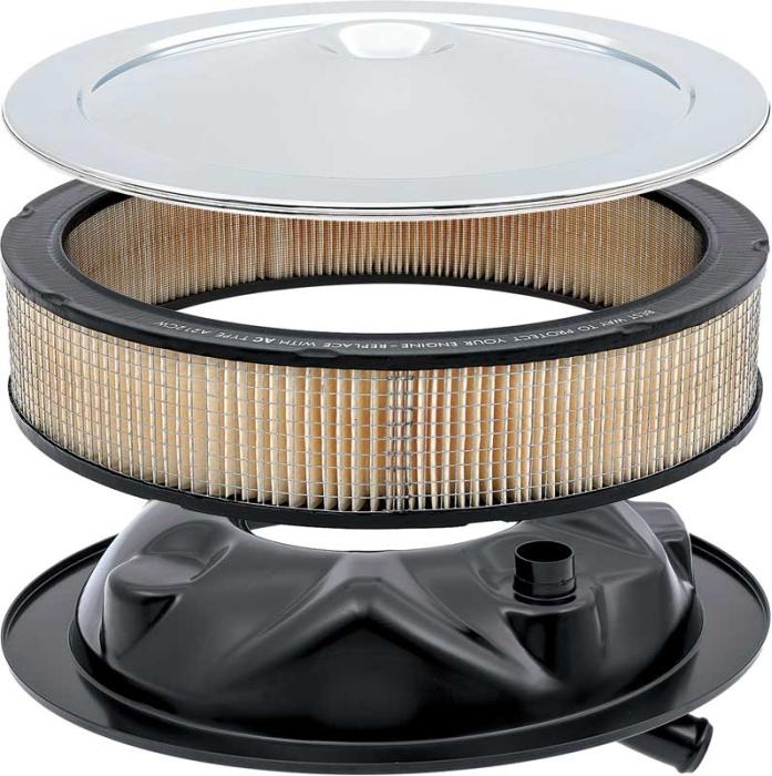 Features include "Air Filter Service Instruction" information imprinted in black on the underside of the chrome lid, in the authentic square pattern as original. Air filter element features the correct metal screen pattern, properly colored paper element, and white screen imprint with "Protect Your Engine - Replace With AC Type A212CW" markings along edge of filter as original. Correct printing and fonts are used to ensure complete accuracy and originality. The recessed base fits 5-1/8" carbureters and the filter dimensions are 14" x 3".