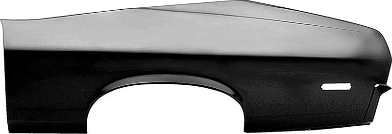 Reproduction of the original-style quarter panel skin designed for use on 1973-74 Chevrolet Nova, 1971-72 Pontiac Ventura, 1973 Olds Omega, & Buick Apollo models. This panel is an excellent solution for repairing rust, dents, or minor damage around the wheel well area when replacing the full quarter panel is not necessary. Each panel is manufactured in quality stamped steel to factory specifications for an authentic appearance and fit. The quarter panel skin extends to the top crease of the original quarter panel and is die-cut to run from the door jamb to the bumper area.