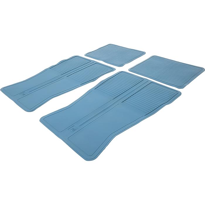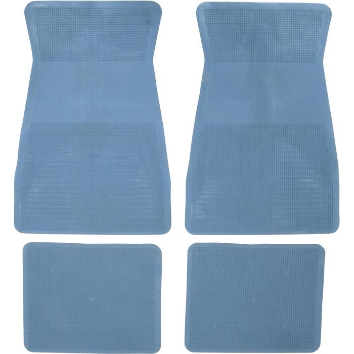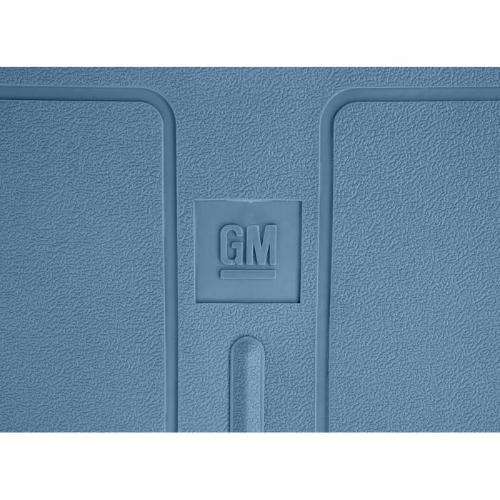 Reproduction rubber floor mats for 1973-87 GM models. Manufactured from automotive grade rubber to factory specifications and die-cut to fit the original contour of the floor pan. Features a GM logo on the front mats, the correct textures, color and anti-slip carpet grippers on the bottom. Available in a 4 piece set with 2 front and 2 rear mats.