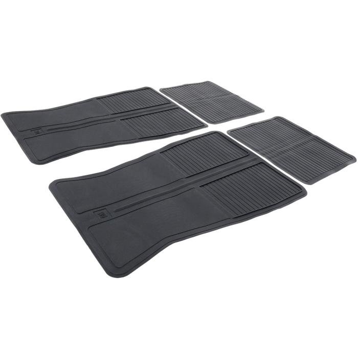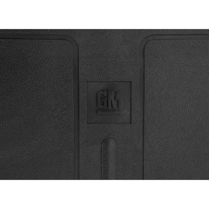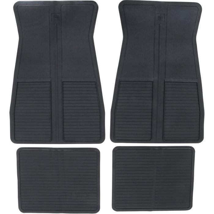 Reproduction of the original style rubber floor mats designed for use with various 1973-93 models including Camaro, Firebird, Impala, Bel Air, Biscayne, Nova, and other GM models. Manufactured from automotive grade rubber to factory specifications and die-cut to fit the original contour of the floor pan. Features a GM logo on the front mats, the correct textures, color and anti-slip carpet grippers on the bottom. Sold as a 4 piece set with 2 front and 2 rear mats.