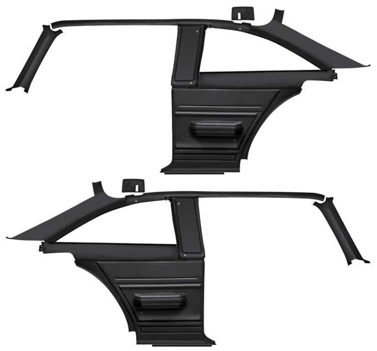 Reproduction of the original interior moldings designed for use with 1975-79 Nova, 1975-77 Pontiac Ventura, 1976-79 Pontiac Acadia, 1975 Buick Apollo, 1975-79 Buick Skylark, 1975-79 Olds Omega models two door models. Each molding is Injection molded as original and will replace the damaged, cracked or missing original. Sold in set of 14 pieces. Includes RH and LH rear interior side panel moldings, front pillar post moldings, headliner trim moldings, window post moldings, quarter window pillar moldings, and seat belt retractors.