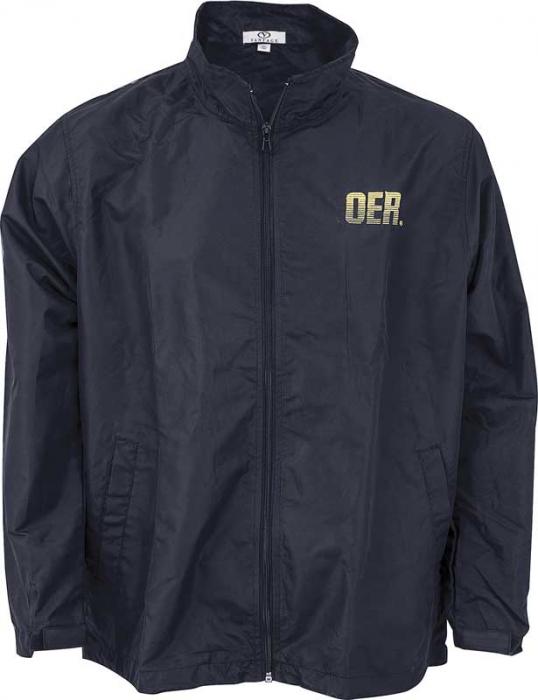 Black 100% cotton, fineline sanded twill fabric, unlined, elastic waist jacket features an embroidered trademark yellow OER® logo, heavy duty antique brass zipper and hand warmer pockets.
