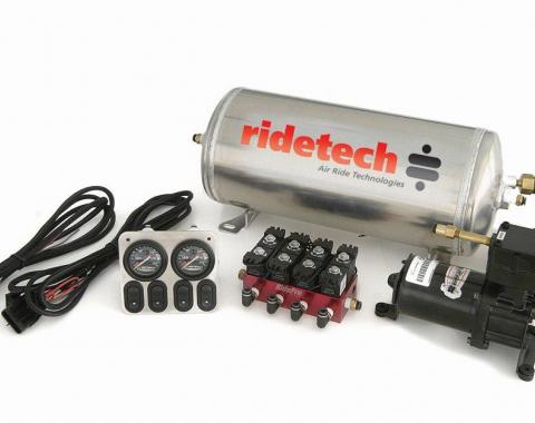 3 gallon compressor leveling system with 1/4″ air valve manual 4 way switches and gauges. This 3 gallon tank and single compressor design is recommended for vehicles under 3500 lbs. Includes separate aluminum 3 gallon tank, RidePRO…