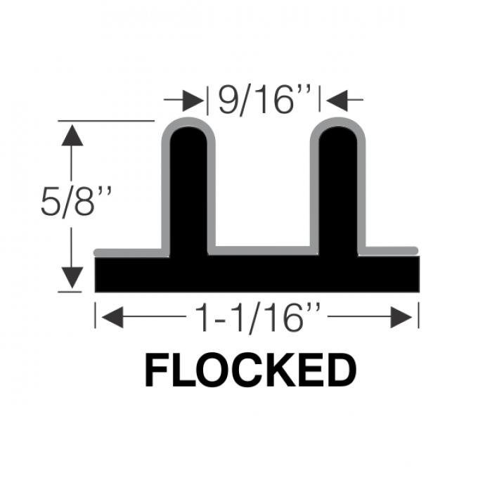 Channel, side window, pre-flocked, nine sixteenths (9/16) inch wide to accommodate metal frame side window. Most convertible bodies except those using stainless beaded channel.